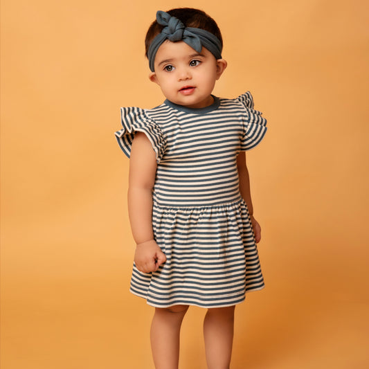 Teal Stripe Organic Short Sleeve Dress With Frill