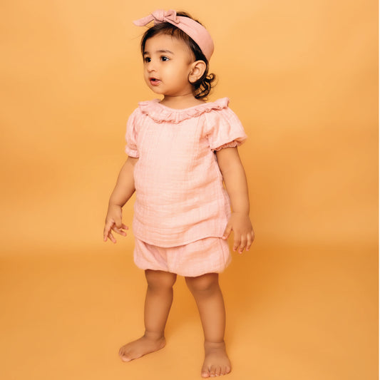Blush Pink Organic Muslin Frill Top With Bloomers