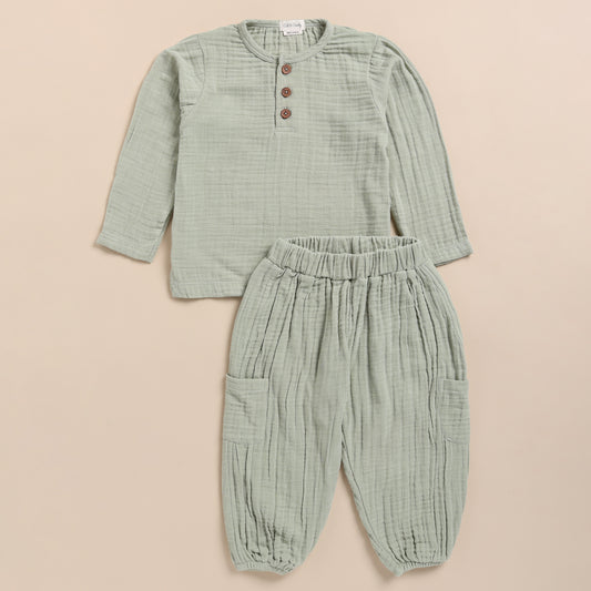 Sage Organic Muslin Long Sleeve Henley Tshirt With Lounge Pant Set