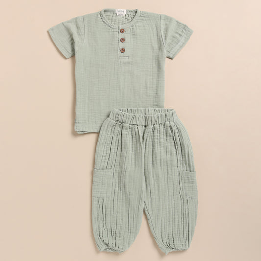 Sage Organic Muslin Short Sleeve Henley Tshirt With Lounge Pant Set