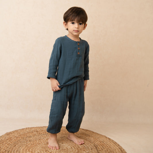 Navy Organic Muslin Long Sleeve Henley Tshirt With Lounge Pant Set