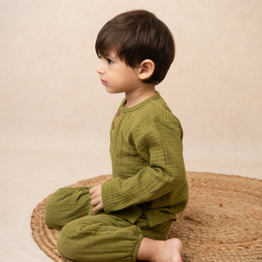 Olive Organic Muslin Long Sleeve Henley Tshirt With Lounge Pant Set