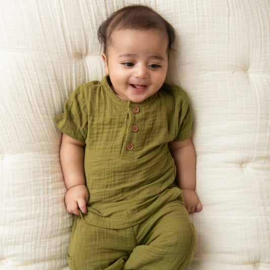 Olive Organic Muslin Short Sleeve Henley Tshirt With Lounge Pant Set