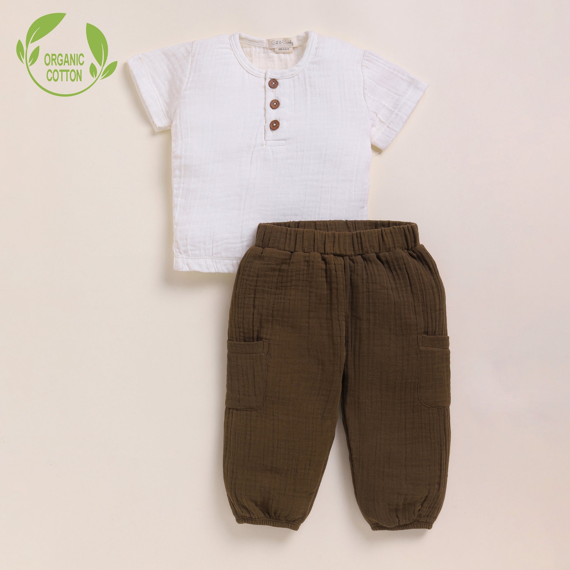 Introducing the Cot & Candy Baby Muslin Henley T-Shirt and Jogger Set, a perfect blend of style, comfort, and sustainability. Crafted from GOTS Certified Organic Cotton, this premium set ensures your little one stays cozy in fabric that is as eco-friendly as it is gentle on delicate skin.