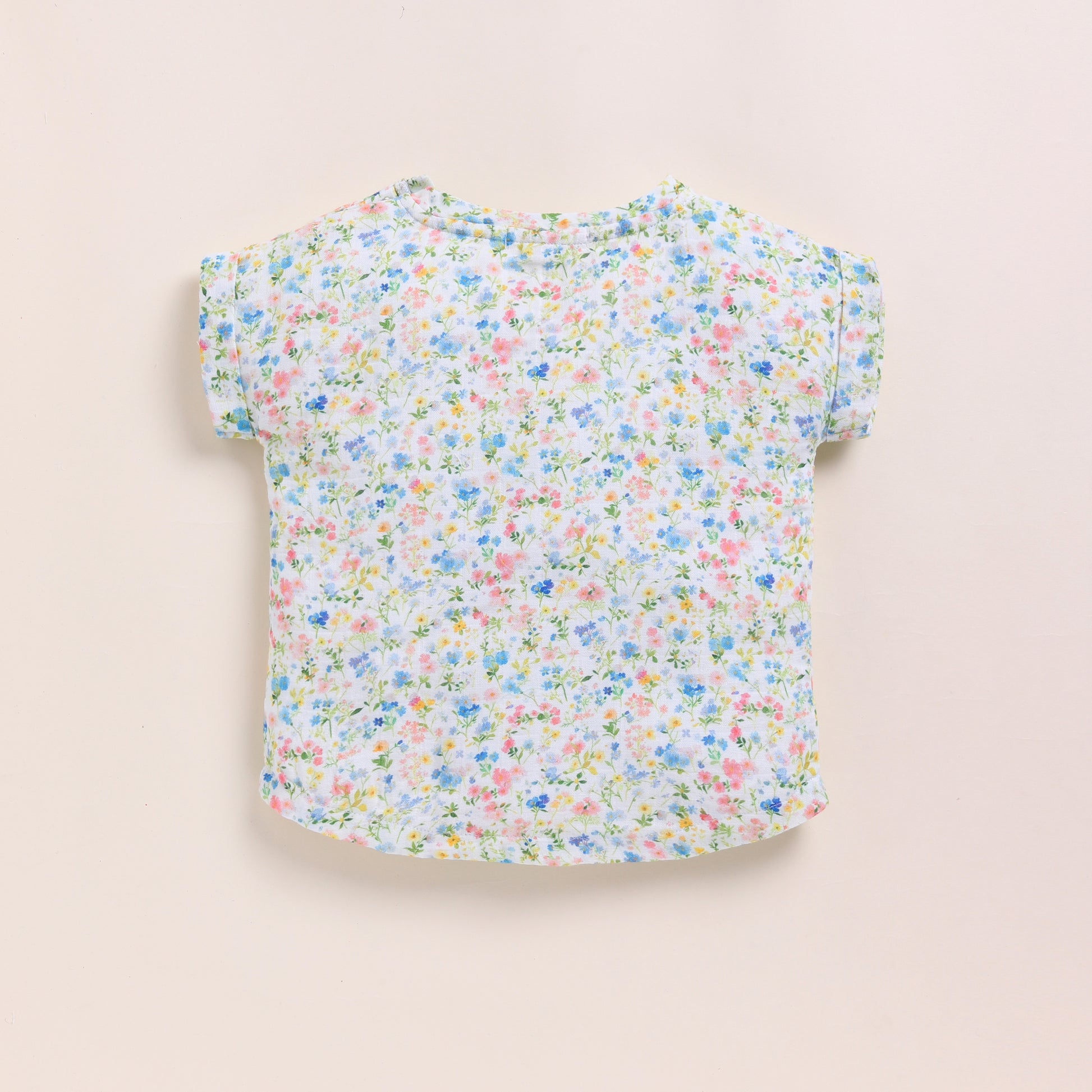 Adorned with a delicate, all-over floral pattern lovingly named "Spring Floral", the print captures the whimsical charm of a sun-kissed wildflower field in full bloom. Soft hues of pastel pinks, cornflower blues, and fresh greens dance across the light, airy fabric, evoking the innocence and beauty of nature.